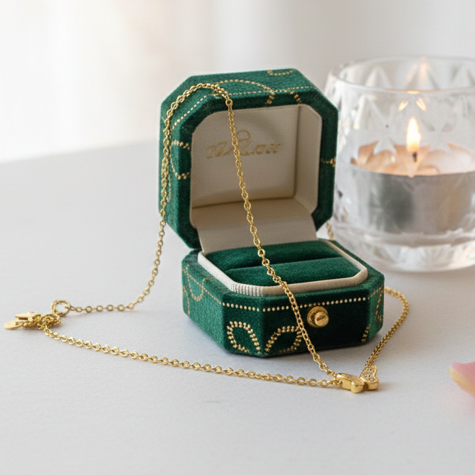 Butterfly Necklace, a delicate golden chain, features an exquisitely crafted butterfly pendant, its wings adorned with a subtle sparkle. This elegant piece symbolizes transformation and grace, perfect for adding a touch of sophisticated charm to any outfit. Its minimalist design makes it versatile for both everyday wear and special occasions, radiating a quiet luxury that speaks volumes.