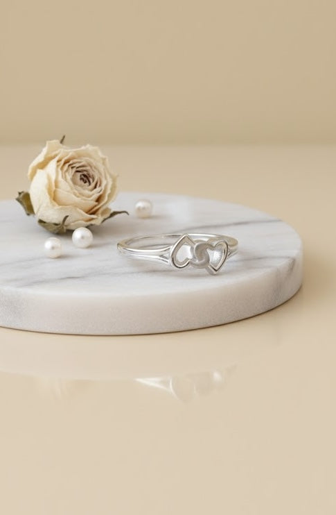This minimalist silver ring features two beautifully entwined hearts, symbolizing eternal connection and devotion. The hearts are finished in a soft, matte texture, providing an elegant contrast to the band's bright, polished shine. Designed for everyday wear, it is a subtle yet meaningful accessory perfect for gifting or expressing a treasured bond.