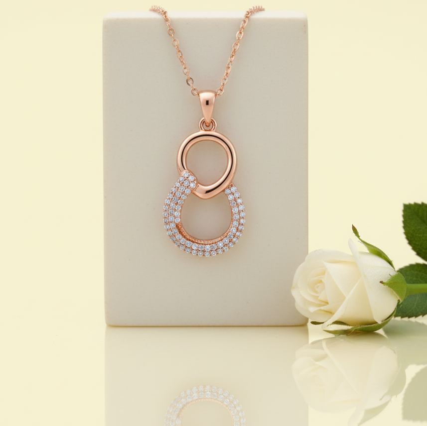 This elegant pendant features a captivating design with two interlocking loops, one gracefully adorned with shimmering, brilliant-cut stones. Crafted with a polished rose gold finish, its intricate details catch the light beautifully, offering a sophisticated touch to any attire. Perfect for adding a subtle yet radiant sparkle, this piece is a versatile accessory for both everyday wear and special occasions.