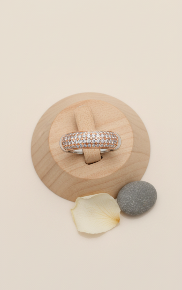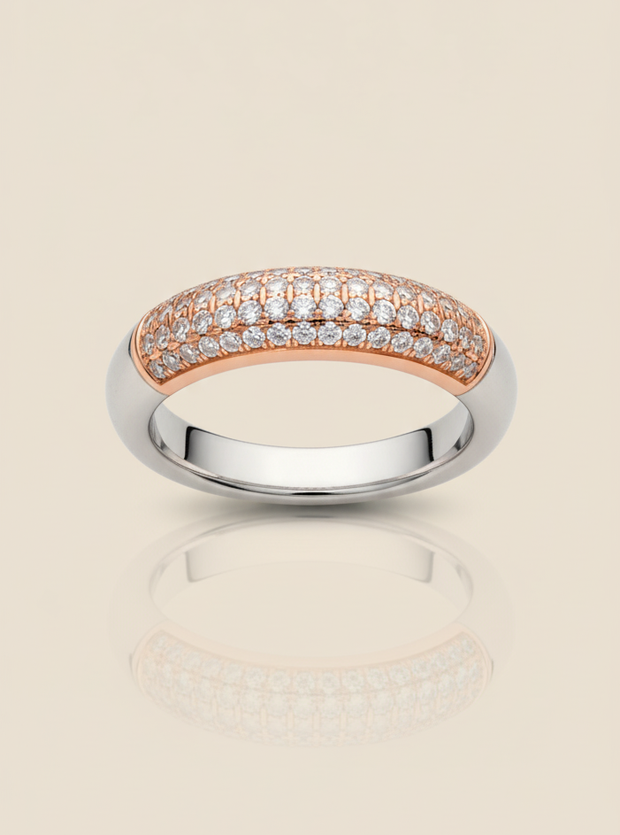 This exquisite ring, crafted with a harmonious blend of rose gold and silver tones, features a captivating band adorned with brilliant, meticulously set stones. Its elegant design showcases a luxurious sparkle that beautifully catches the light, making it a perfect symbol of refined taste. The unique two-tone finish and delicate craftsmanship create a sophisticated piece ideal for any occasion, adding a touch of timeless glamour to your collection.